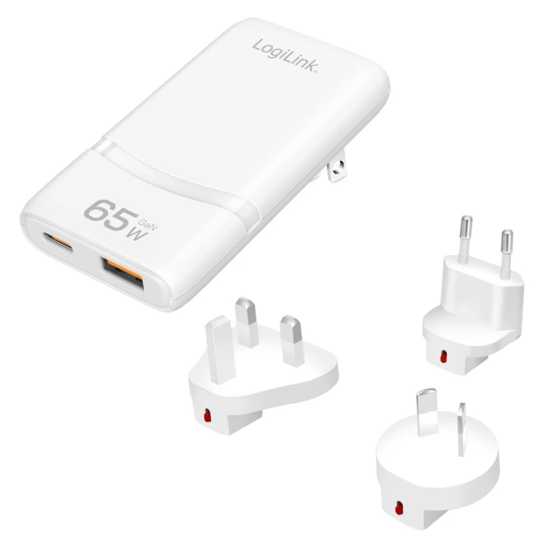 Ładowarka sieciowa podróżna LogiLink PA0376 USB GaN, 65 W, 1x USB-C (PD), 1x USB-A (QC), biała